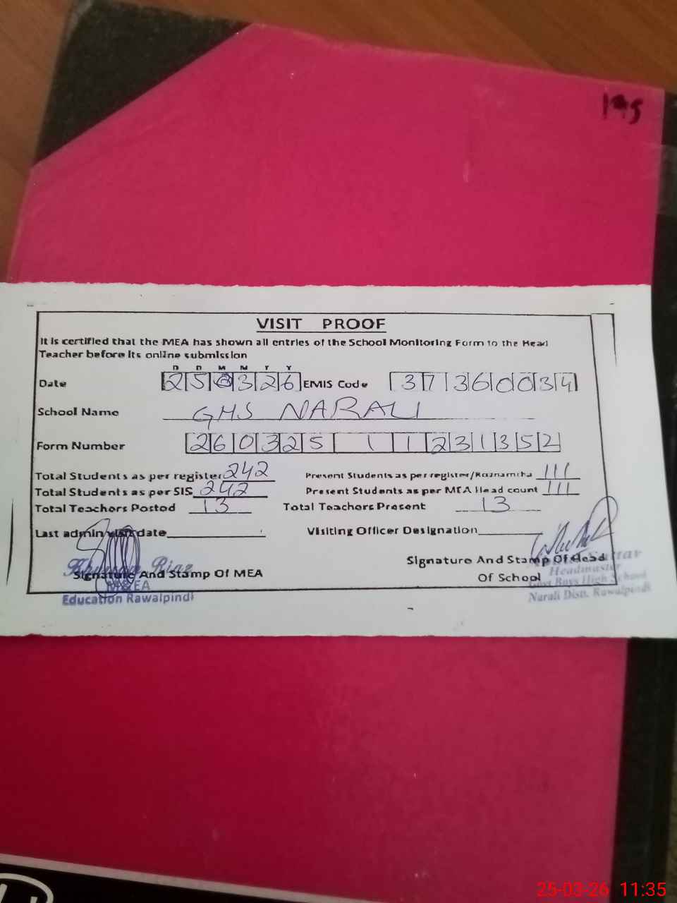 | Certified that this School was Inspected by the Undersigned MEA/DMO Today and the Information Stated Above is as Per Record. | |||||