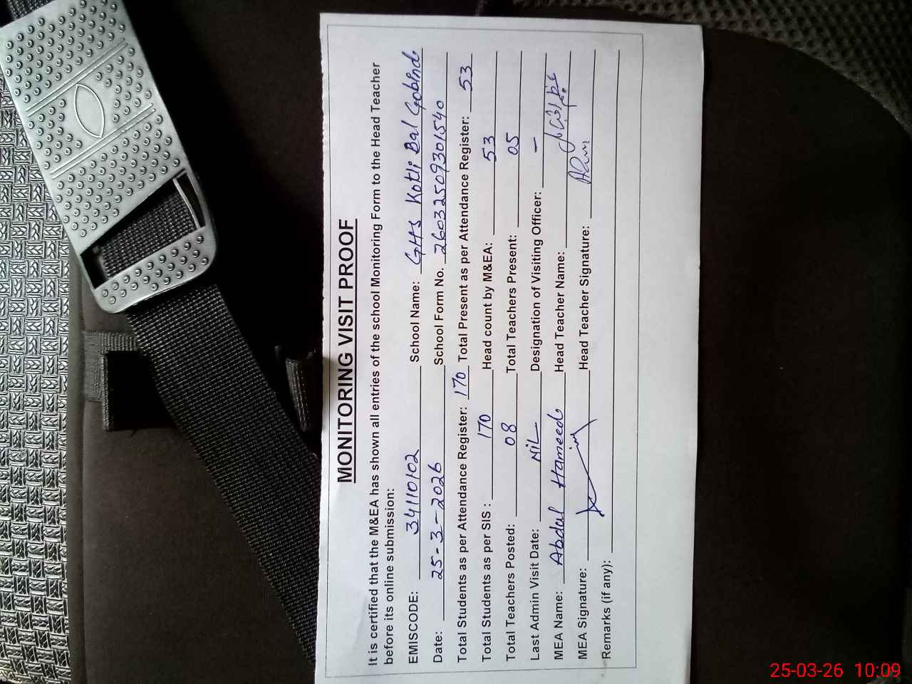 | Attendance Register | Head Teacher | MEA with School | Visit Proof |