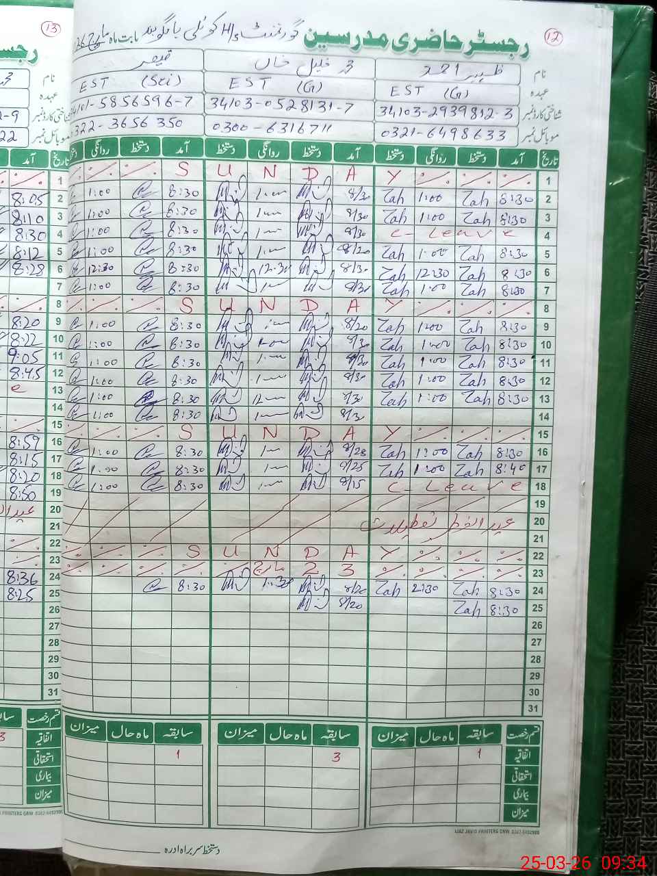 | CNIC | Full Name | Designation | R/C | Absence During Last Calender Month |