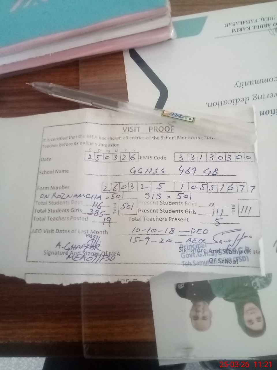| Attendance Register | Head Teacher | MEA with School | Visit Proof |