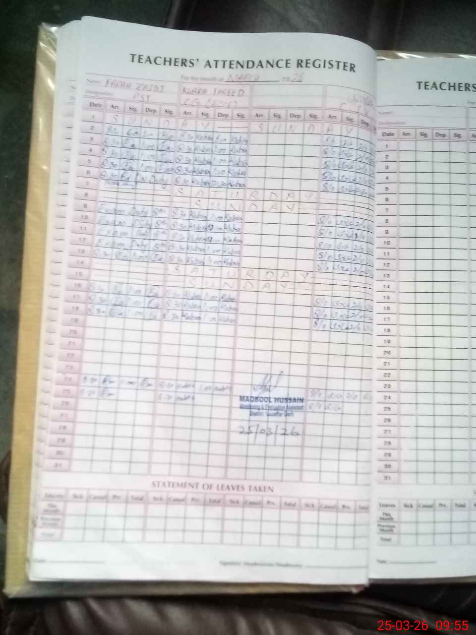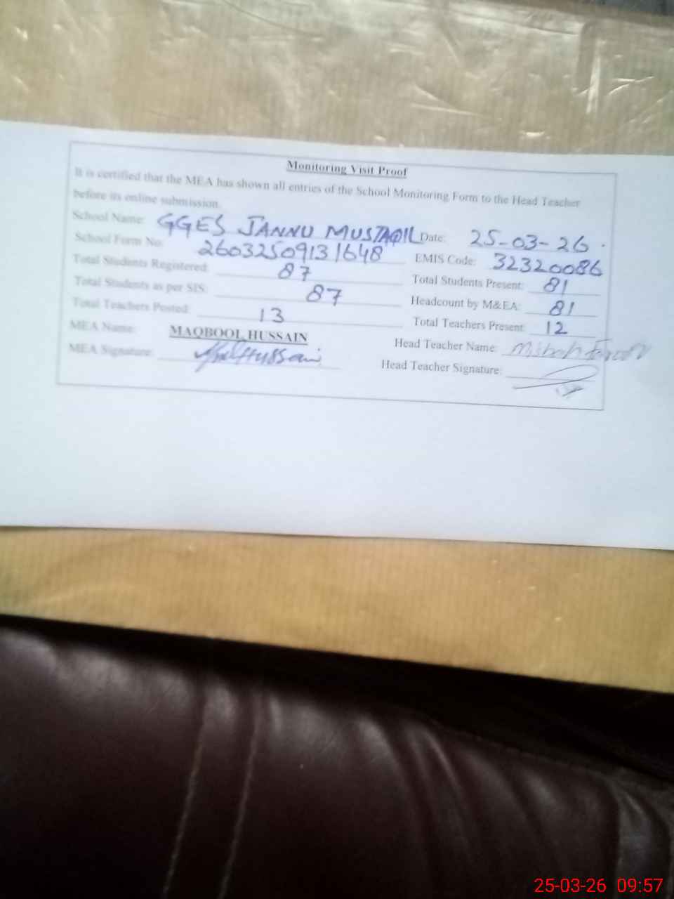 | Attendance Register | Head Teacher | MEA with School | Visit Proof |
