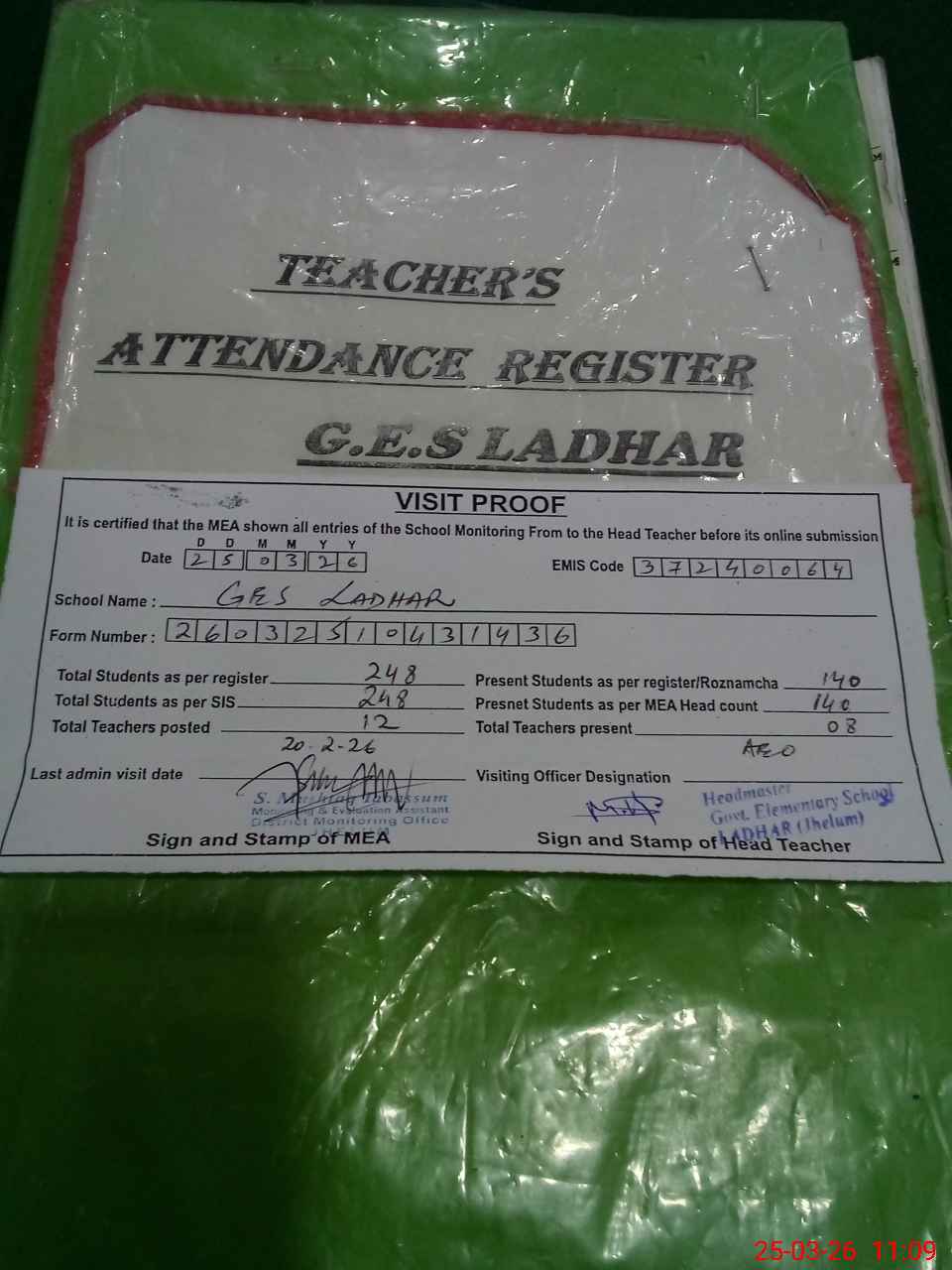 | Attendance Register | Head Teacher | MEA with School | Visit Proof |