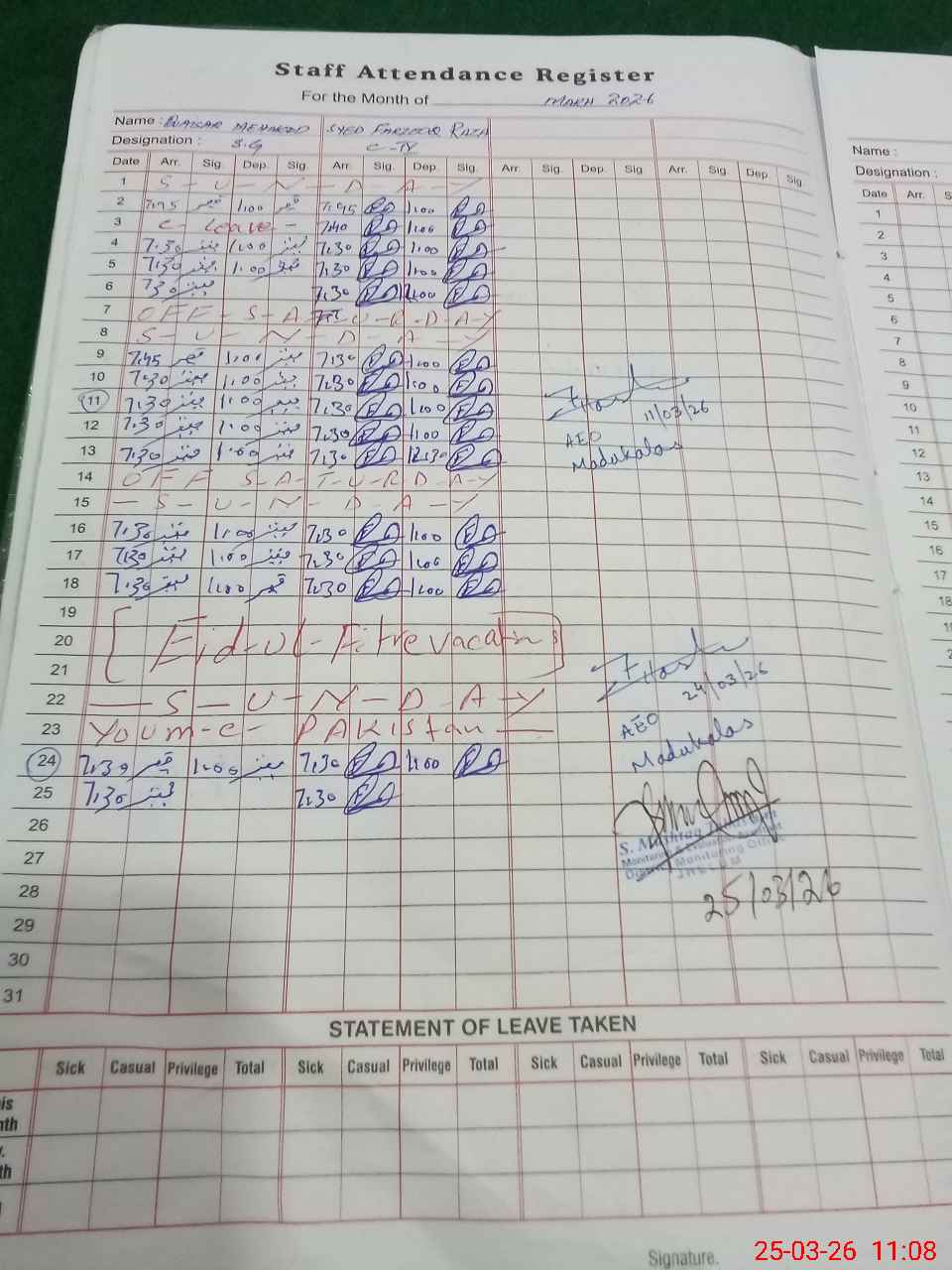 | 37**** | Sh**** Ta**** | PST Arts | Regular | 0 | 0 | 0 | 0 | 0 | 0 | 0 | 0 | 0 | Absent (Un-Authorized) |