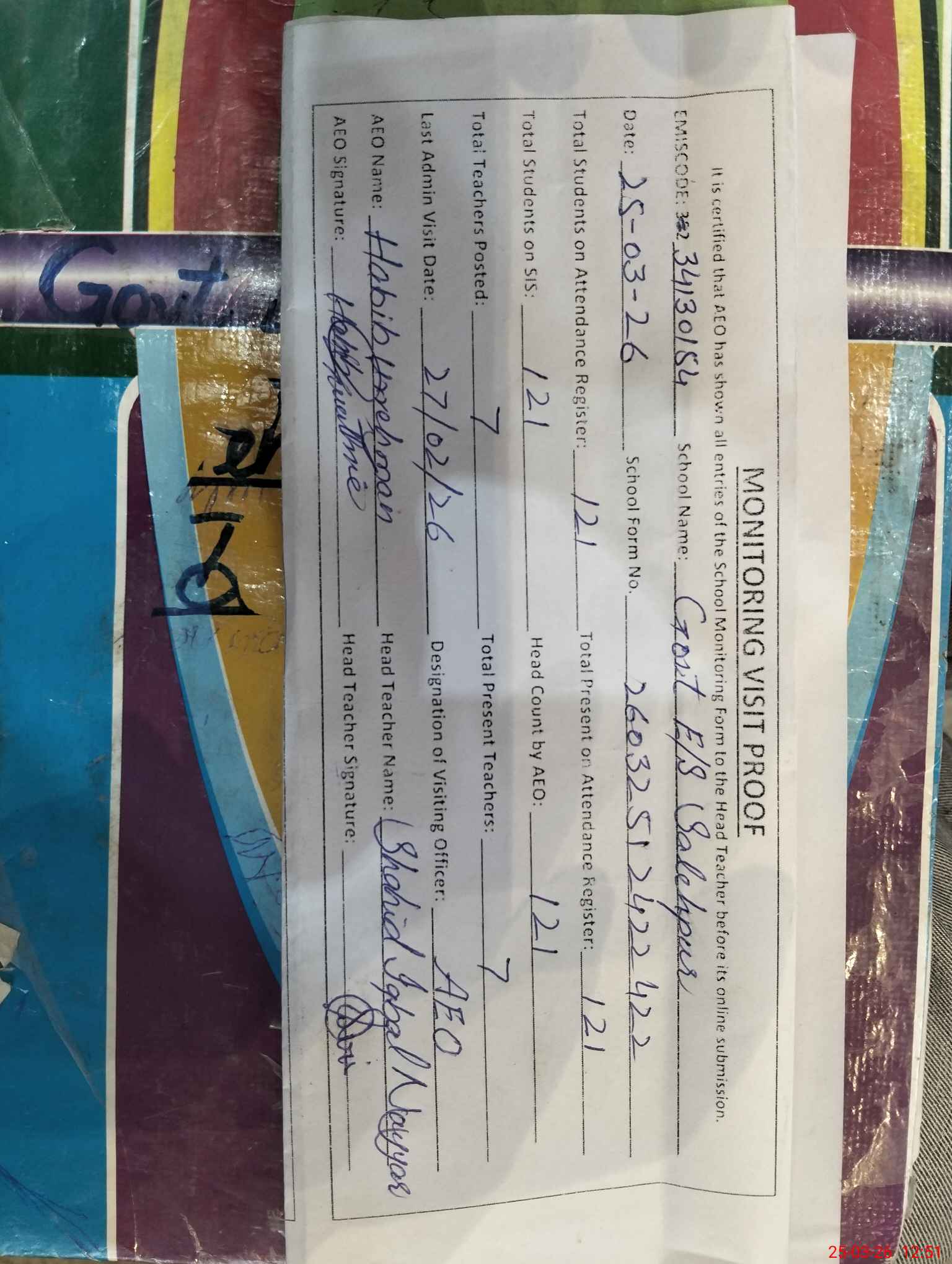 | Attendance Register | Head Teacher | MEA with School | Visit Proof |