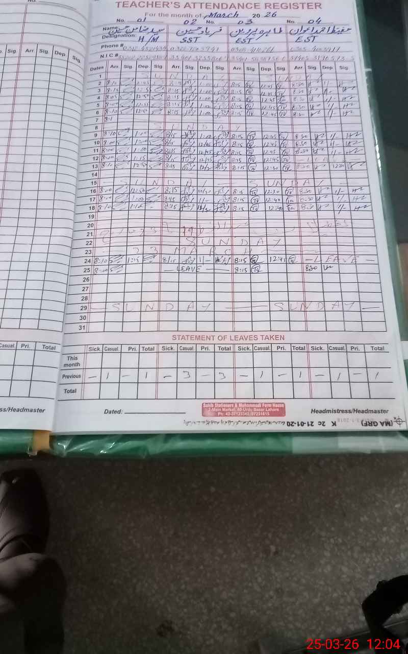 | Remarks (Use Separate Page if Required): Teacher Sidra Afzal PST Removed from service wef 29.10.25 by order Education Department. | |||||
