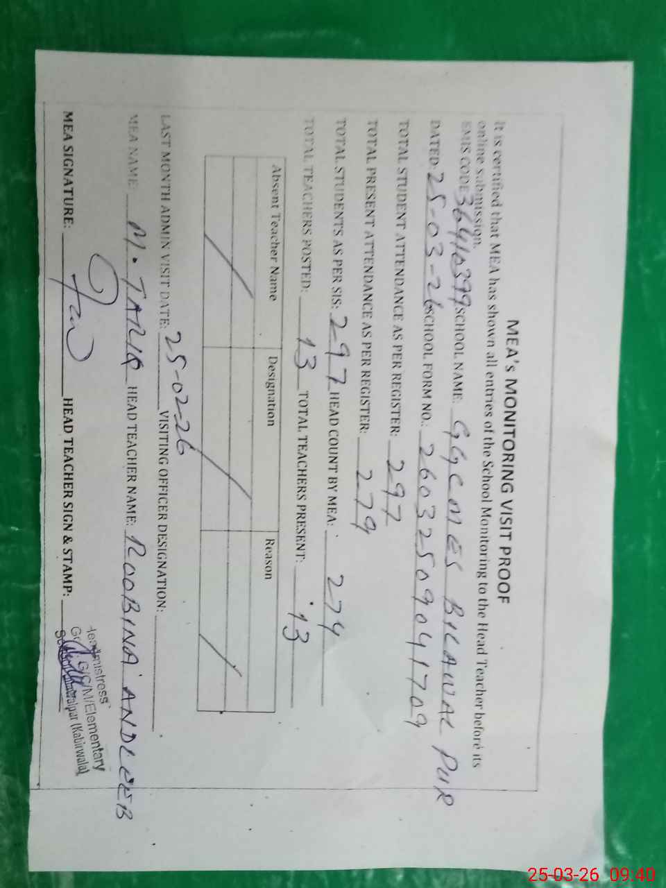 | Remarks (Use Separate Page if Required): Most of the students specially primary portion were on exam 'OFF''. 01 STI joined in the school from 03 October, 2025. | |||||