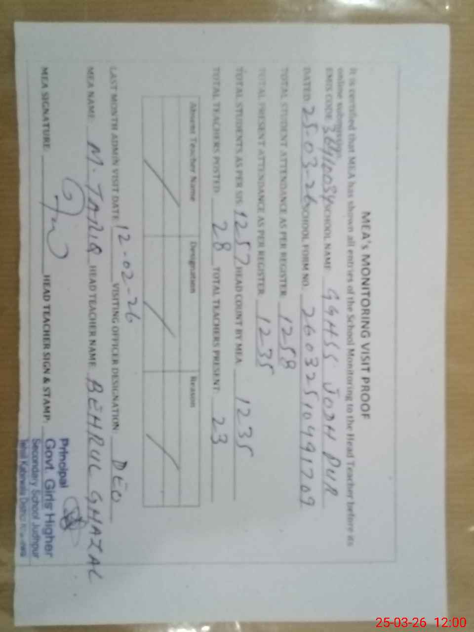| Attendance Register | Head Teacher | MEA with School | Visit Proof |
