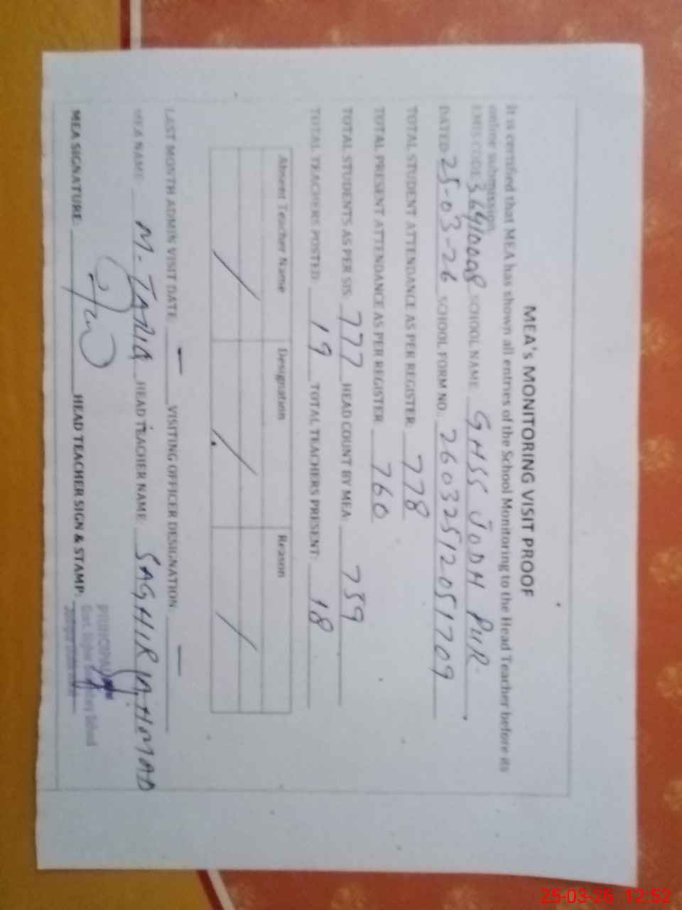 | Attendance Register | Head Teacher | MEA with School | Visit Proof |