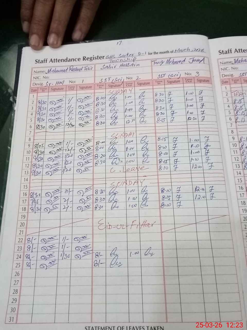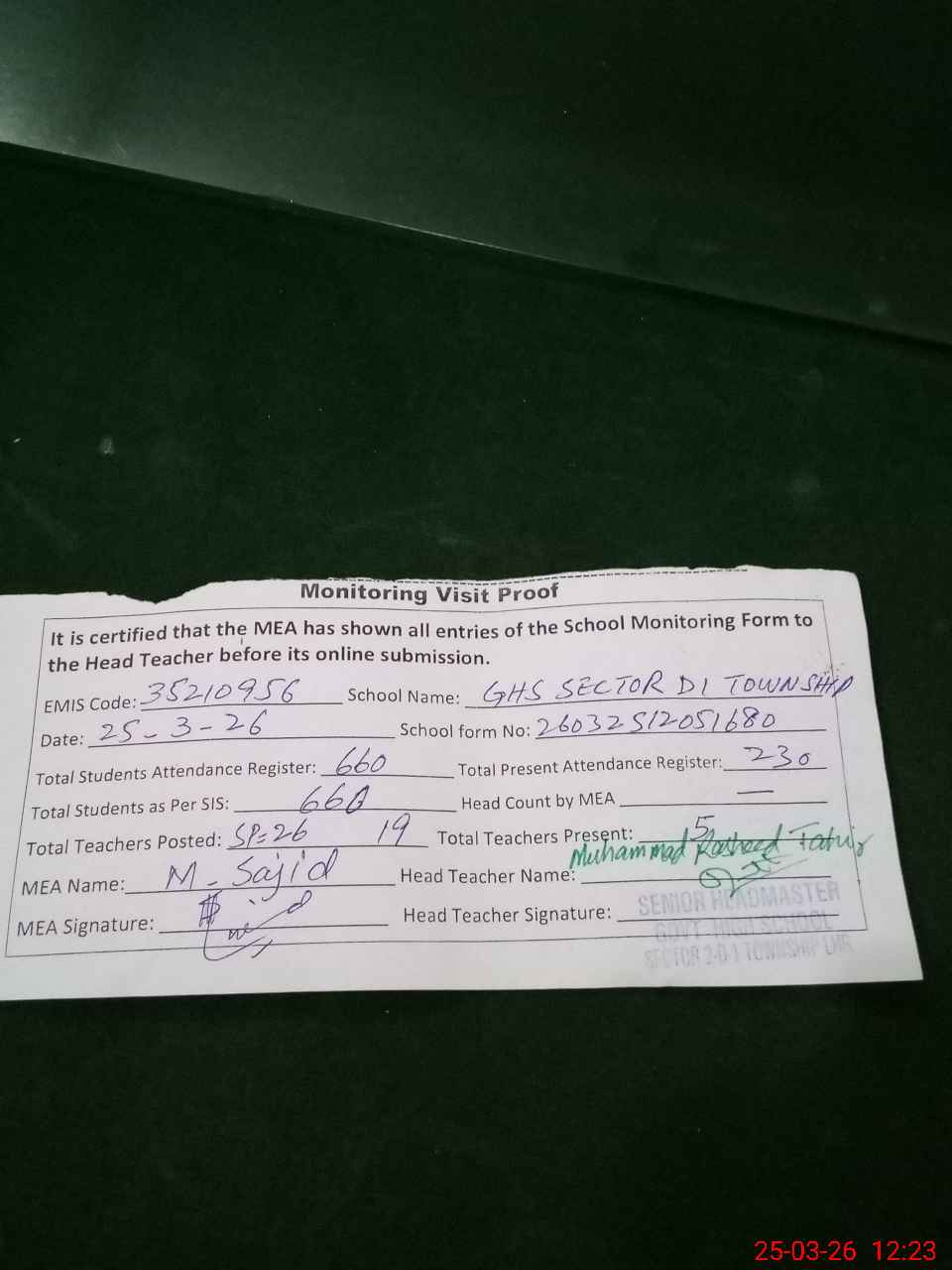 | Remarks (Use Separate Page if Required): 14 teachers are on exam off out of 19 Watch man Shoakat Ali has expired on 24 March 2026 PST Syed Atta Ul Mustafa has been expired on 7 Nov 2025 SSE Shamroz Hussain has joined this school on 24 March 2025 35210956 | |||||