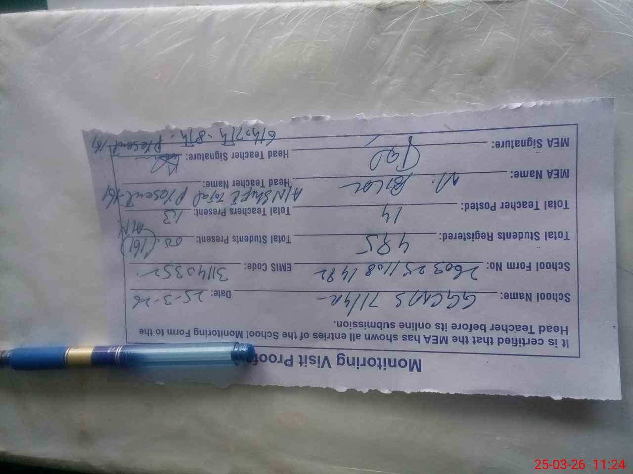 | Attendance Register | Head Teacher | MEA with School | Visit Proof |