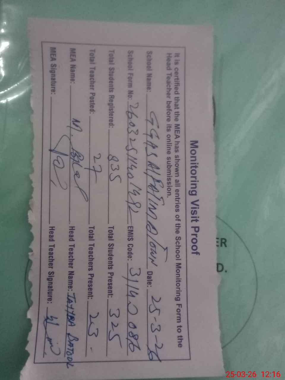 | Attendance Register | Head Teacher | MEA with School | Visit Proof |