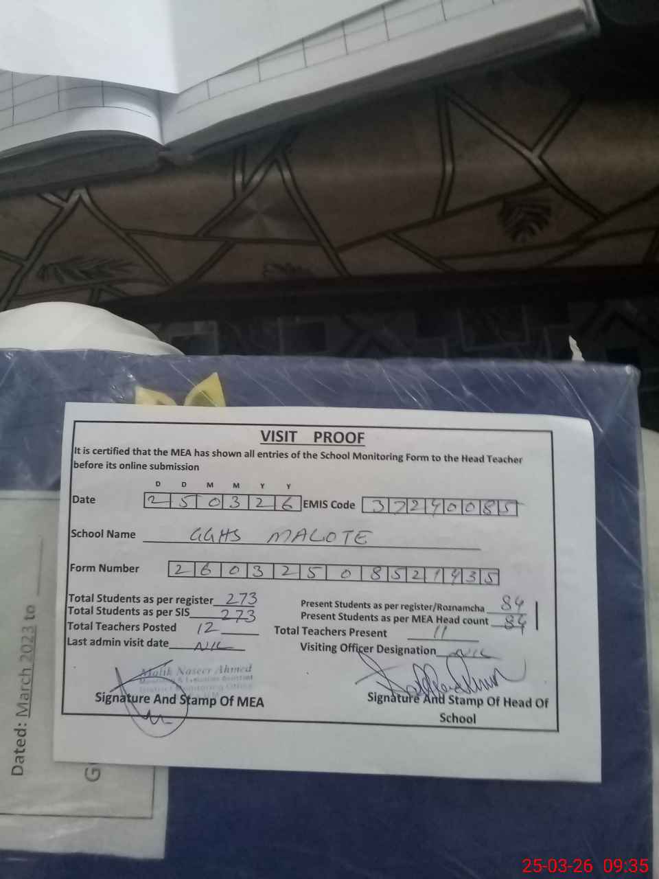 | Attendance Register | Head Teacher | MEA with School | Visit Proof |