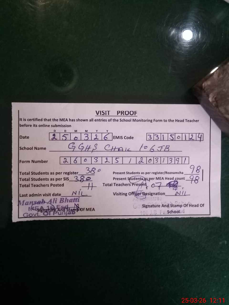 | Attendance Register | Head Teacher | MEA with School | Visit Proof |