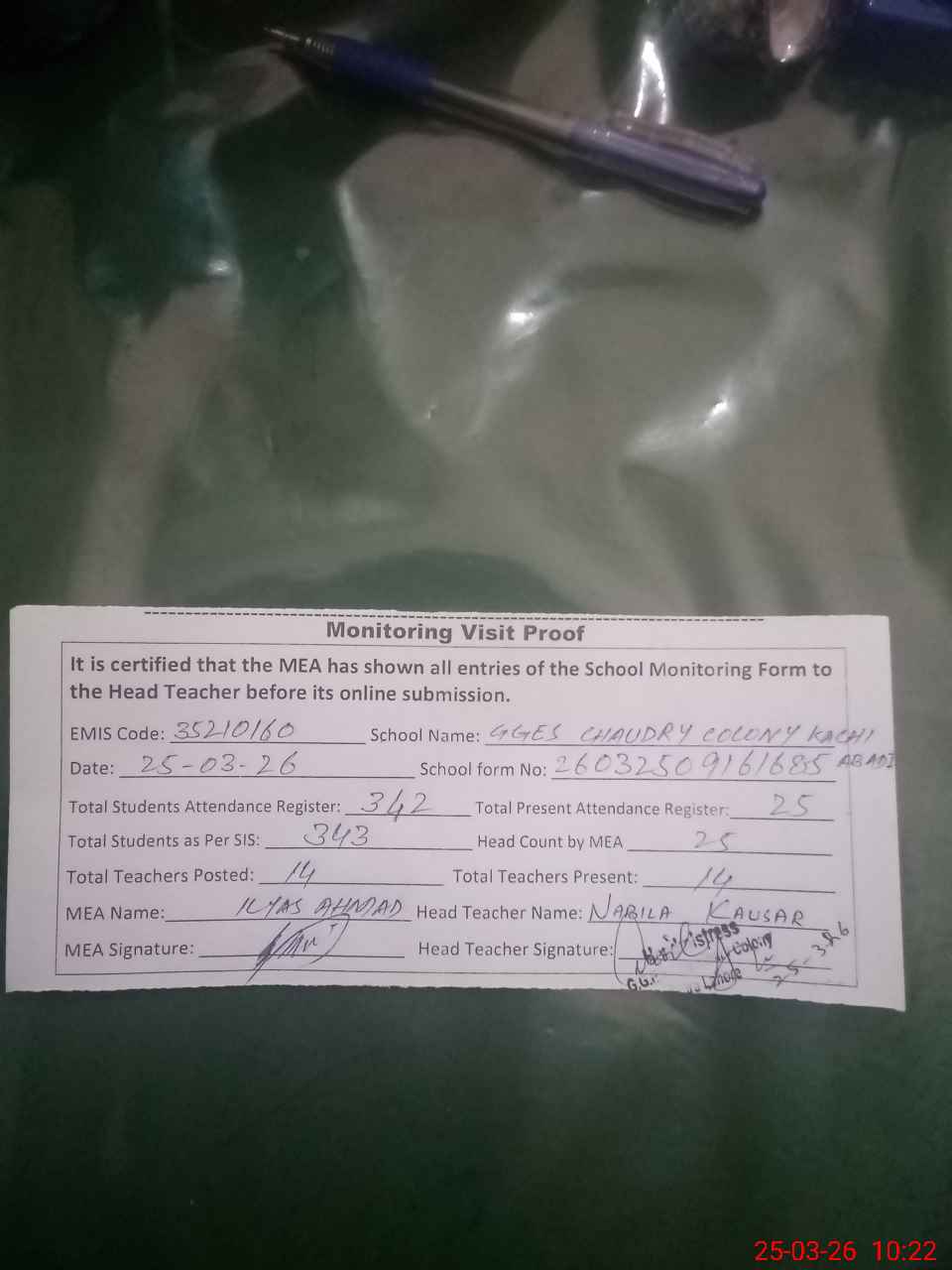 | Attendance Register | Head Teacher | MEA with School | Visit Proof |