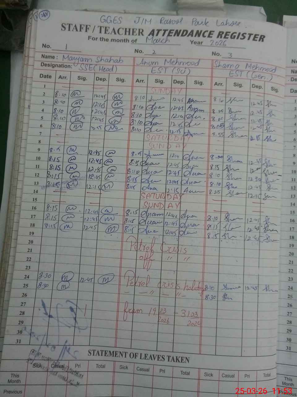 | 35**** | Sh**** Sh**** Al**** | PST Arts | Regular | 0 | 0 | 0 | 0 | 0 | 0 | 0 | 0 | 0 | Exam Duty |