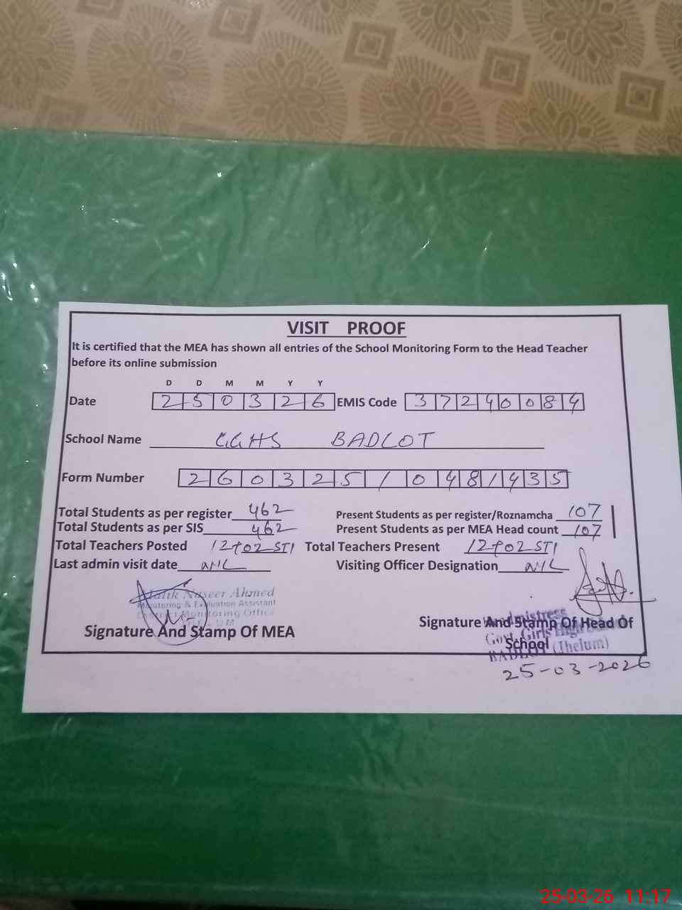 | Attendance Register | Head Teacher | MEA with School | Visit Proof |