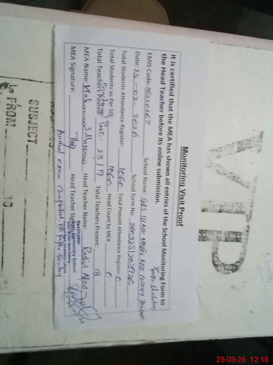 | Attendance Register | Head Teacher | MEA with School | Visit Proof |