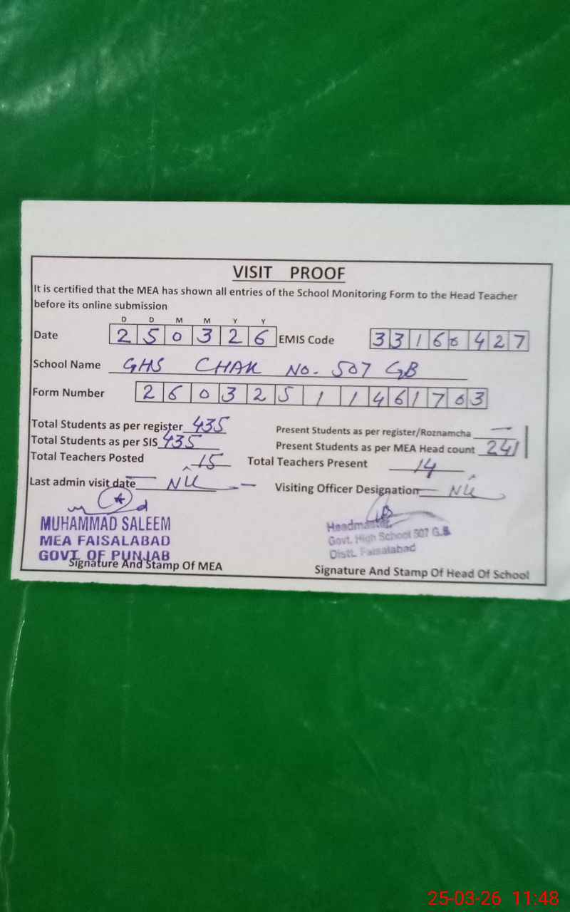 | EMIS Code: 33160427 | Name of School: GHS CHAK 507 GB TANDLIANWALA | |||