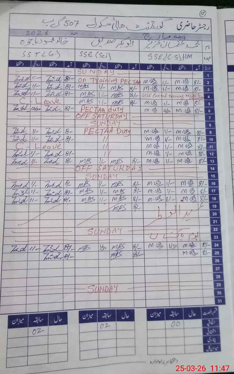 | CNIC | Full Name | Designation | R/C | Absence During Last Calender Month |