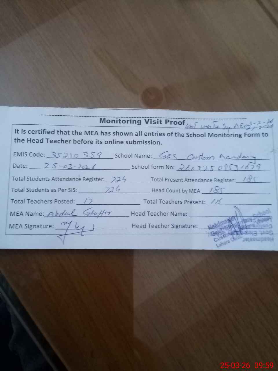 | EMIS Code: 35210359 | Name of School: GES CUSTOM ACADAMY LHR CANTT | |||