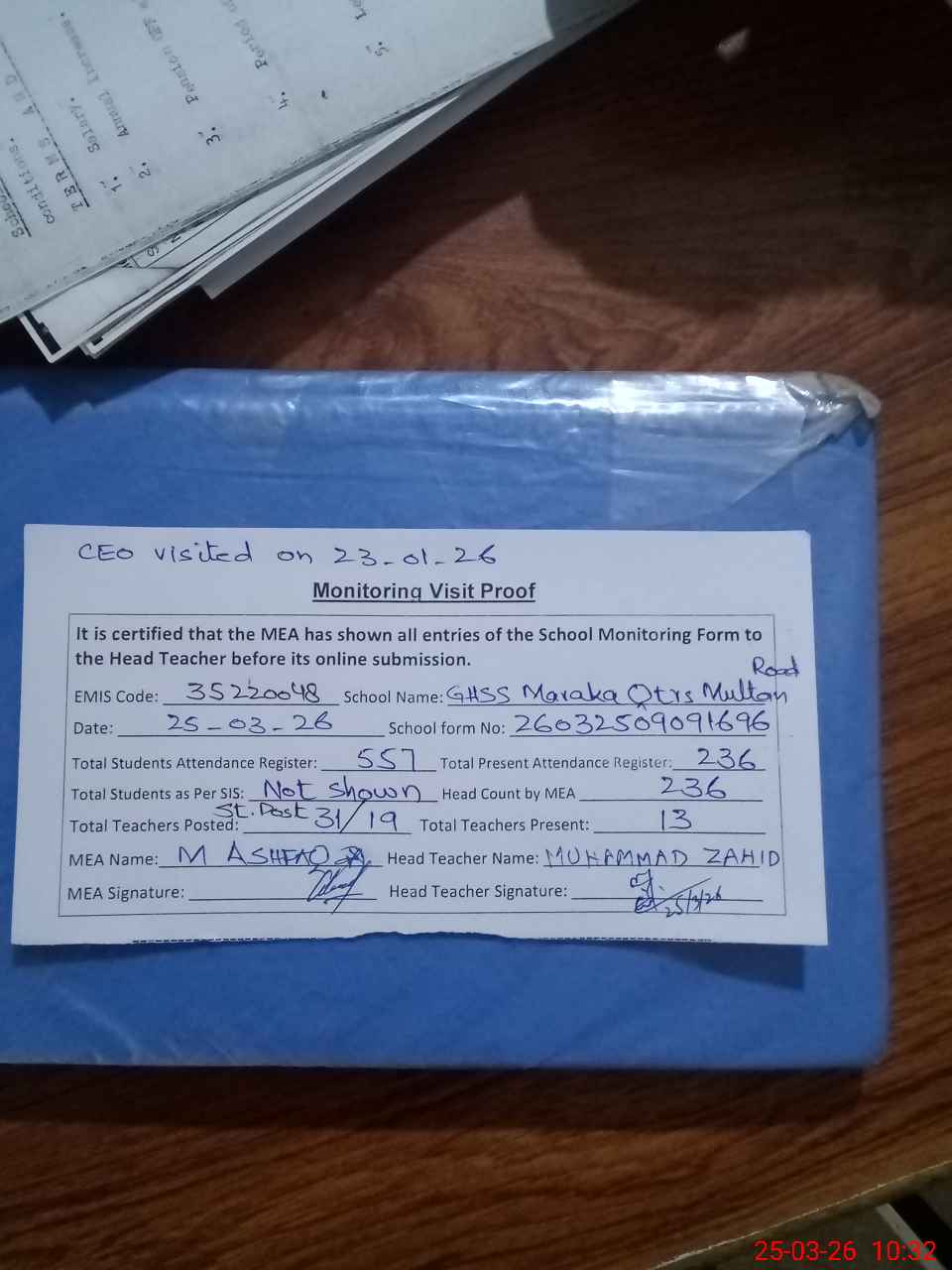 | Remarks (Use Separate Page if Required): SSS Abdul Rahman long absent since 01-01-2024 05 teachers are not present because no papers of their classes. NSB and FTF record and registers not shown Only classes 6th, 7th and 8th are present today and giving SBA paper CEO Nazir Husain Cheena visited on 23-01-2026 02 new toilets under constructions since 20-02-26 and now work has been stopped due to further funds not issues Free Text Books record not shown 35220048 | |||||