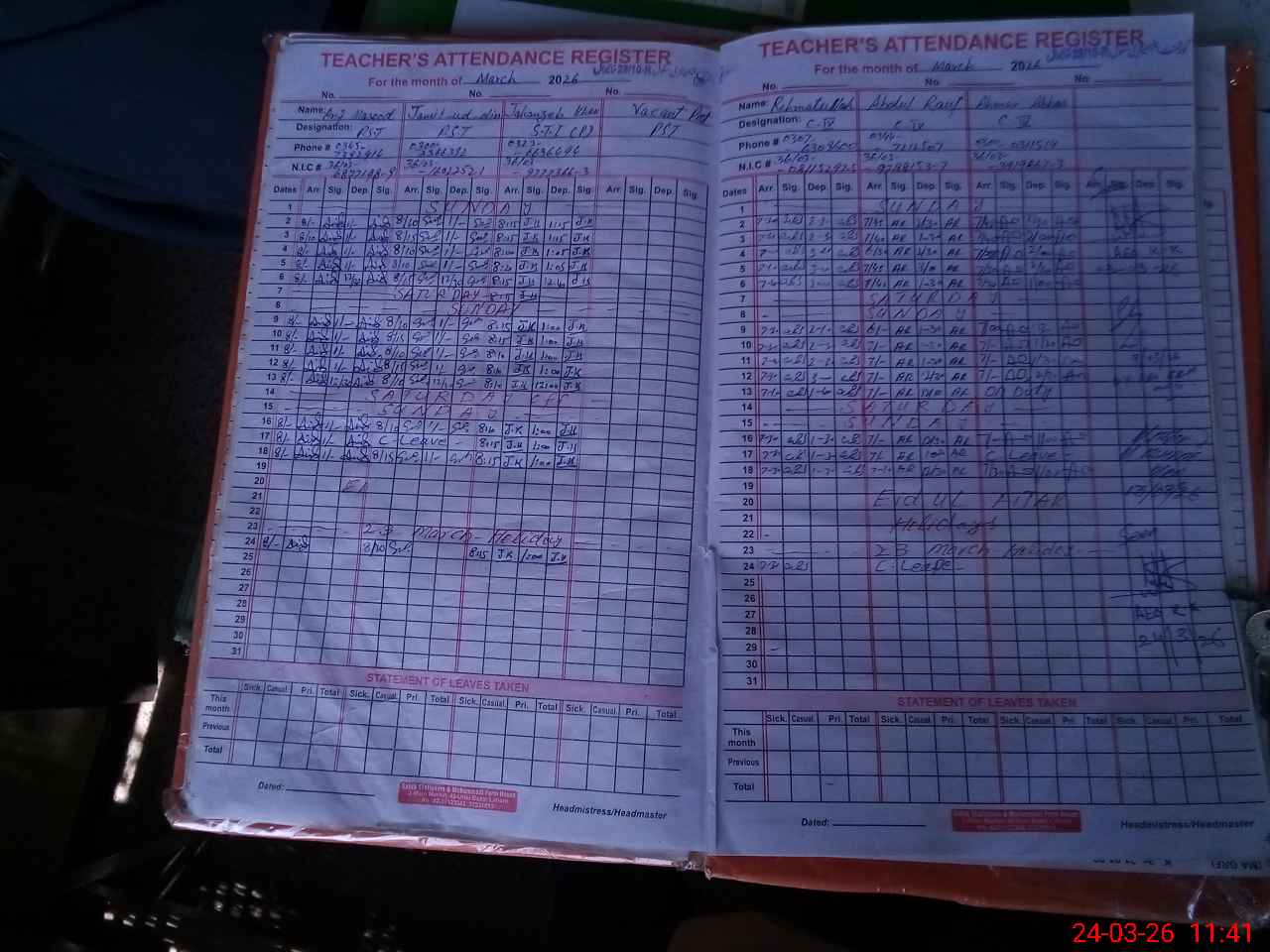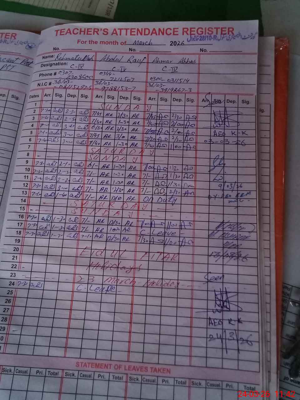 | CNIC | Full Name | Designation | R/C | Absence During Last Calender Month |