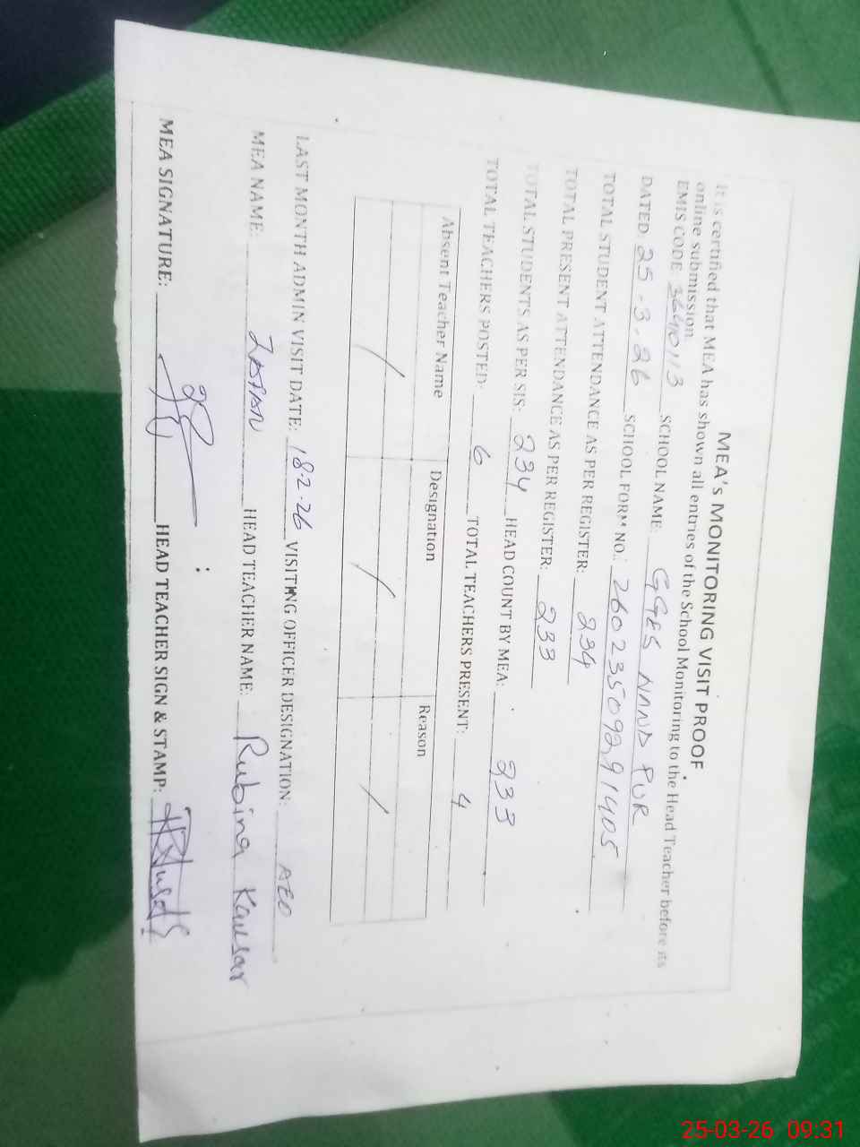 | Attendance Register | Head Teacher | MEA with School | Visit Proof |