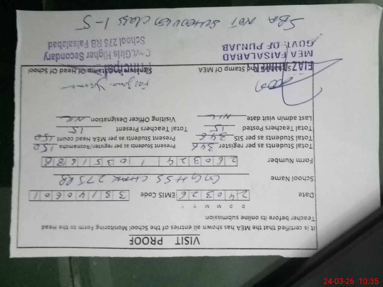 | Certified that this School was Inspected by the Undersigned MEA/DMO Today and the Information Stated Above is as Per Record. | |||||