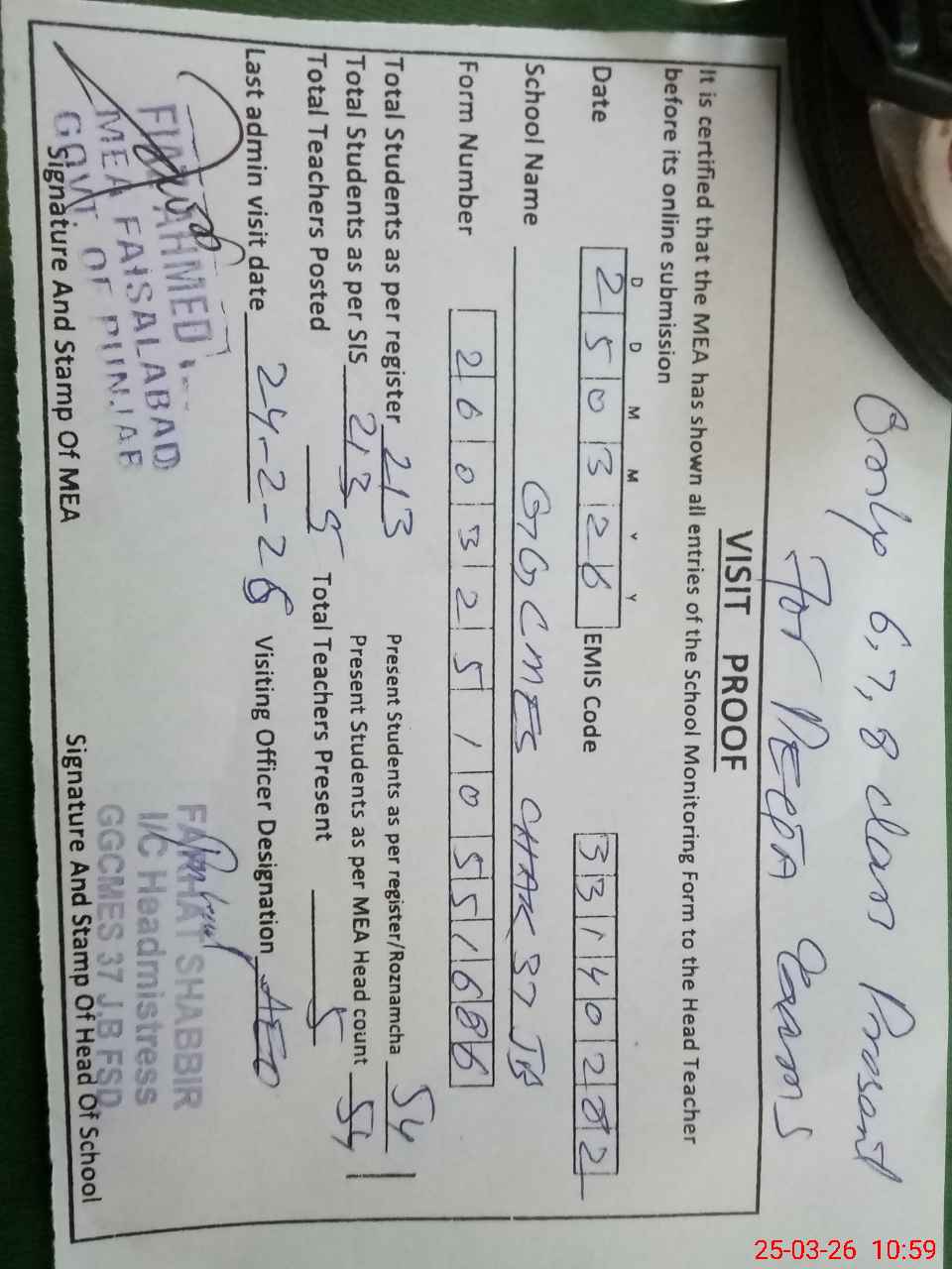 | Certified that this School was Inspected by the Undersigned MEA/DMO Today and the Information Stated Above is as Per Record. | |||||