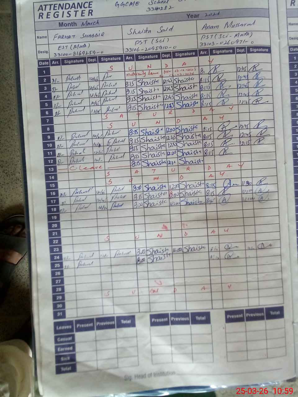 | Leave | Duty | Absent | Maternity | Medical | Ex- Pak |