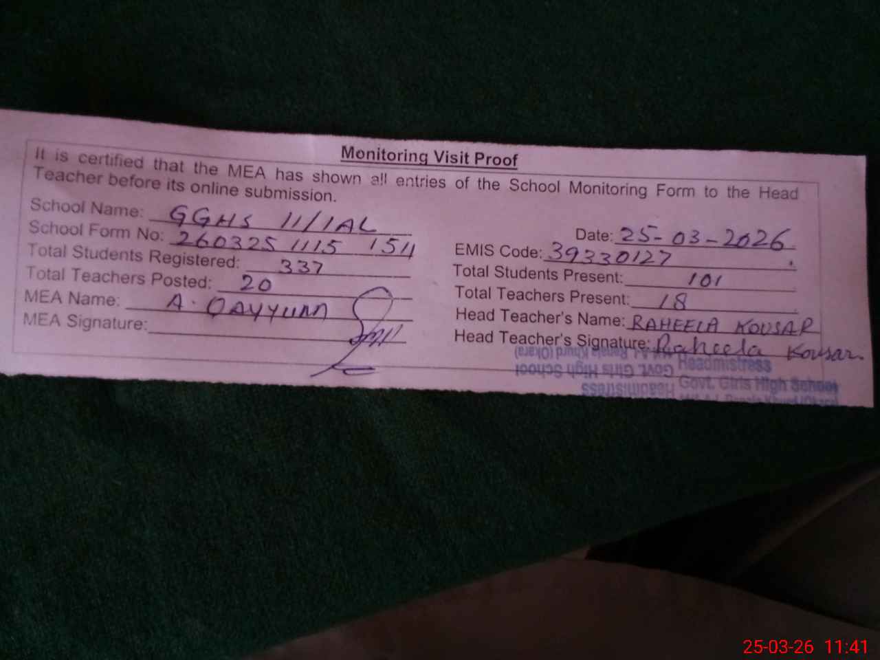 | Certified that this School was Inspected by the Undersigned MEA/DMO Today and the Information Stated Above is as Per Record. | |||||