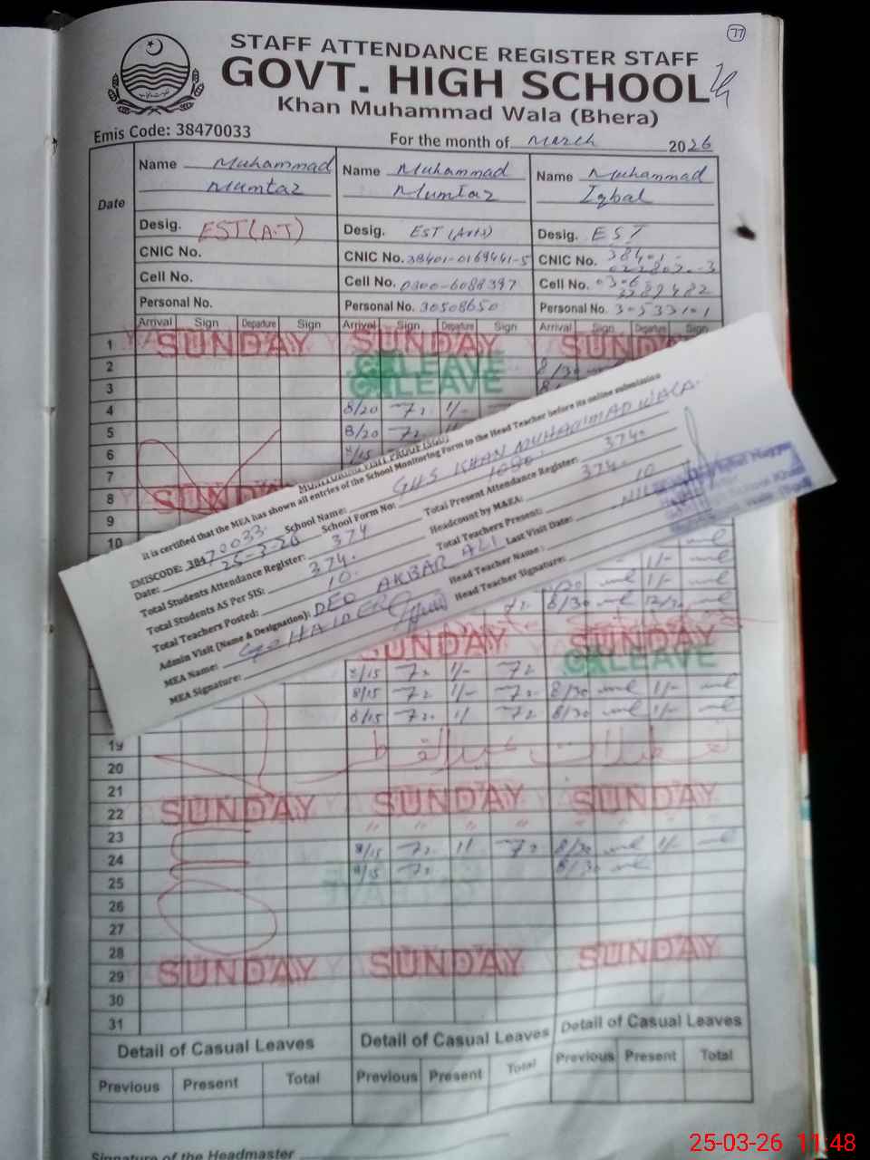 | Name: MU**** NA**** IQ**** Designation: (School Headmaster's/Headmistress's) HEADMASTER Phone/Cell Number: 03**** |