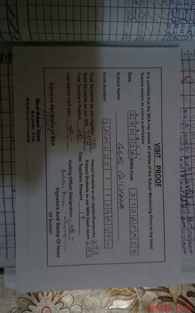 | Certified that this School was Inspected by the Undersigned MEA/DMO Today and the Information Stated Above is as Per Record. | |||||