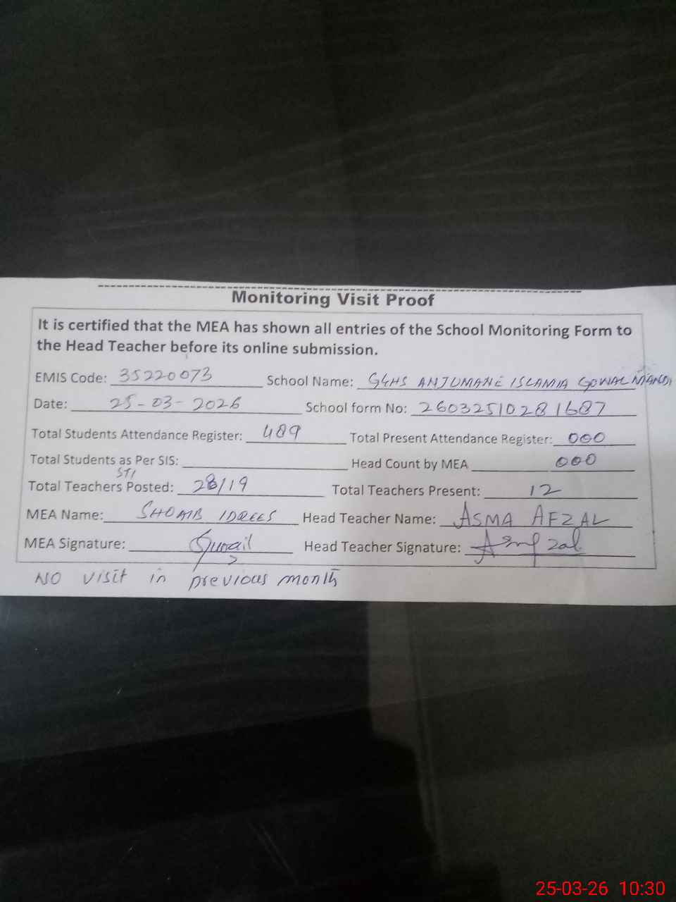| Attendance Register | Head Teacher | MEA with School | Visit Proof |