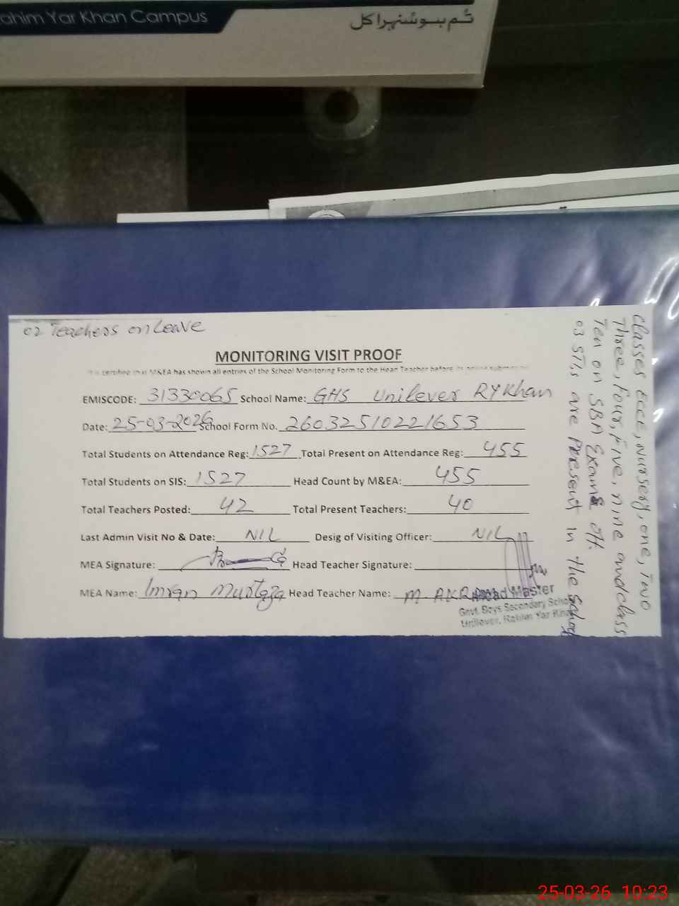 | Attendance Register | Head Teacher | MEA with School | Visit Proof |