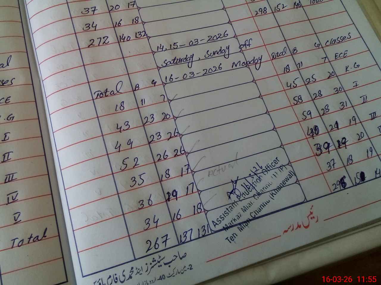 | No. of Students Present - Male | 0 | 11 | 23 | 26 | 18 | 19 | 16 | 136 | ||||||||