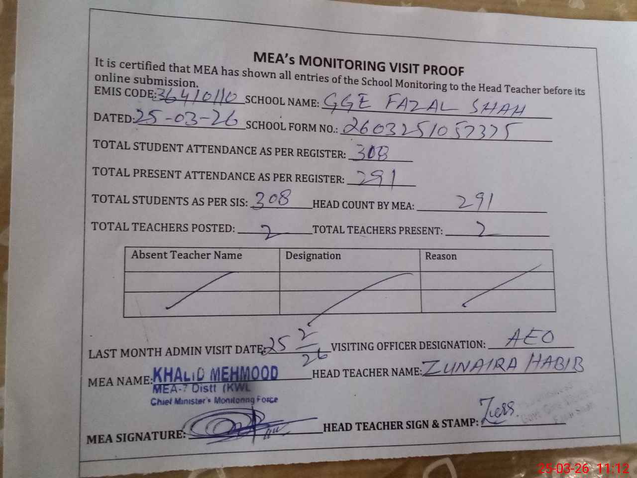 | Attendance Register | Head Teacher | MEA with School | Visit Proof |