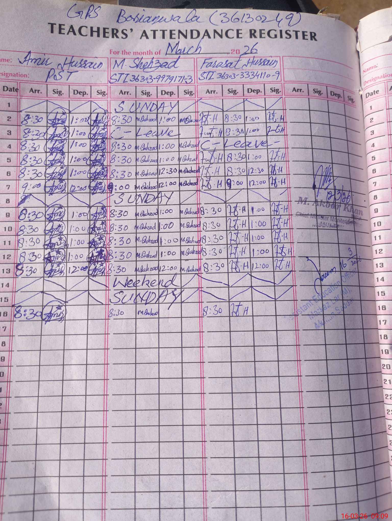 | Name: AA**** HU**** Designation: (School Headmaster's/Headmistress's) HEADMASTER Phone/Cell Number: 03**** |