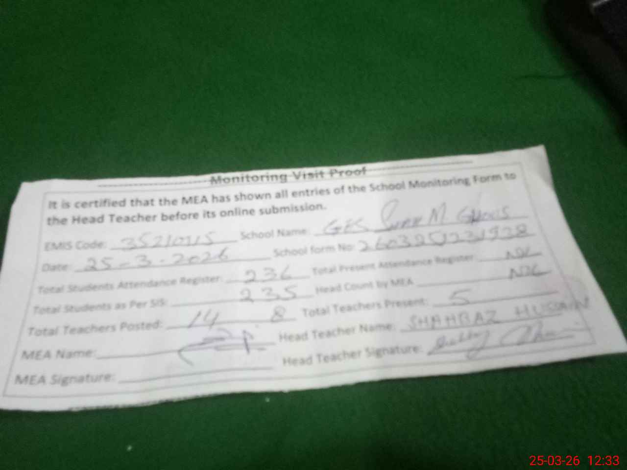 | Attendance Register | Head Teacher | MEA with School | Visit Proof |