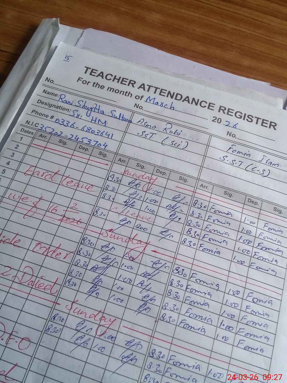 | CNIC | Full Name | Designation | R/C | Absence During Last Calender Month |