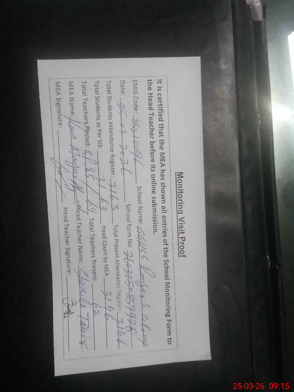 | Attendance Register | Head Teacher | MEA with School | Visit Proof |