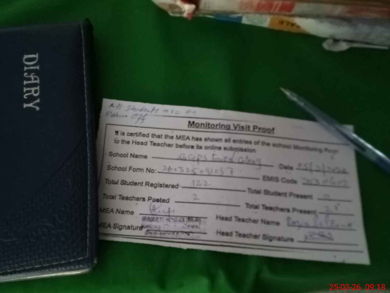 | Attendance Register | Head Teacher | MEA with School | Visit Proof |