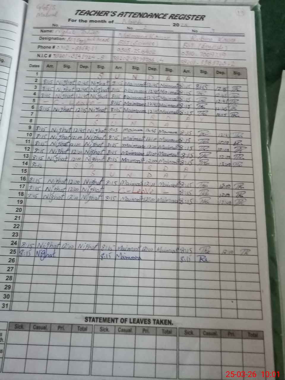 | CNIC | Full Name | Designation | R/C | Absence During Last Calender Month |