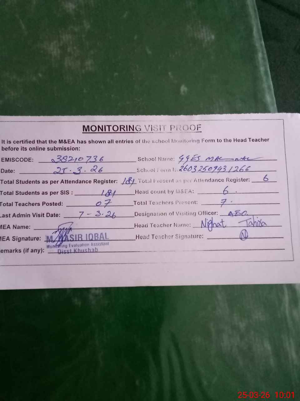 | Attendance Register | Head Teacher | MEA with School | Visit Proof |