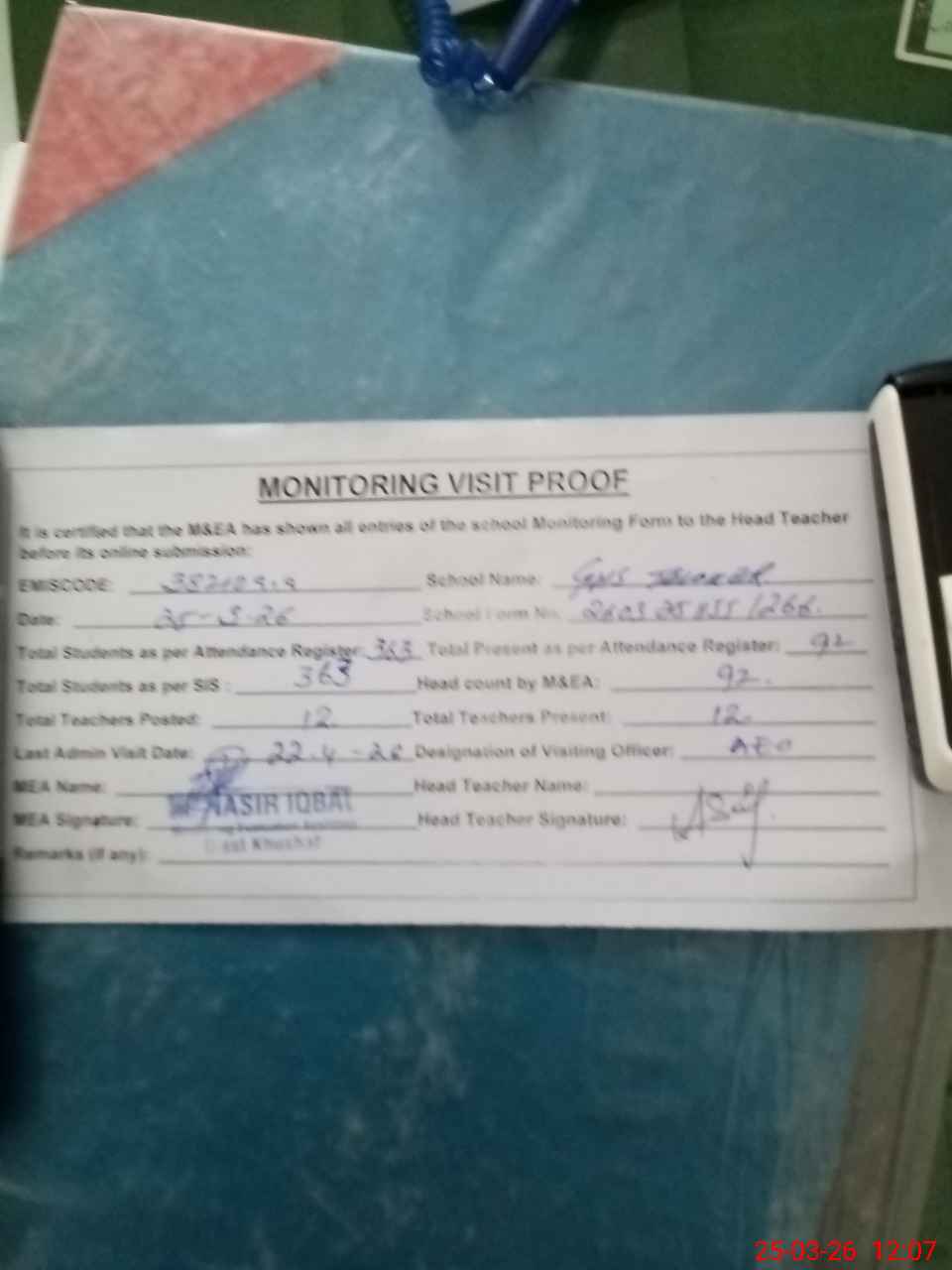 | Attendance Register | Head Teacher | MEA with School | Visit Proof |