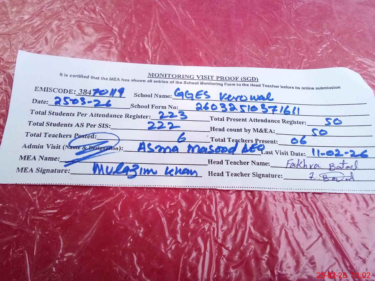 | Attendance Register | Head Teacher | MEA with School | Visit Proof |