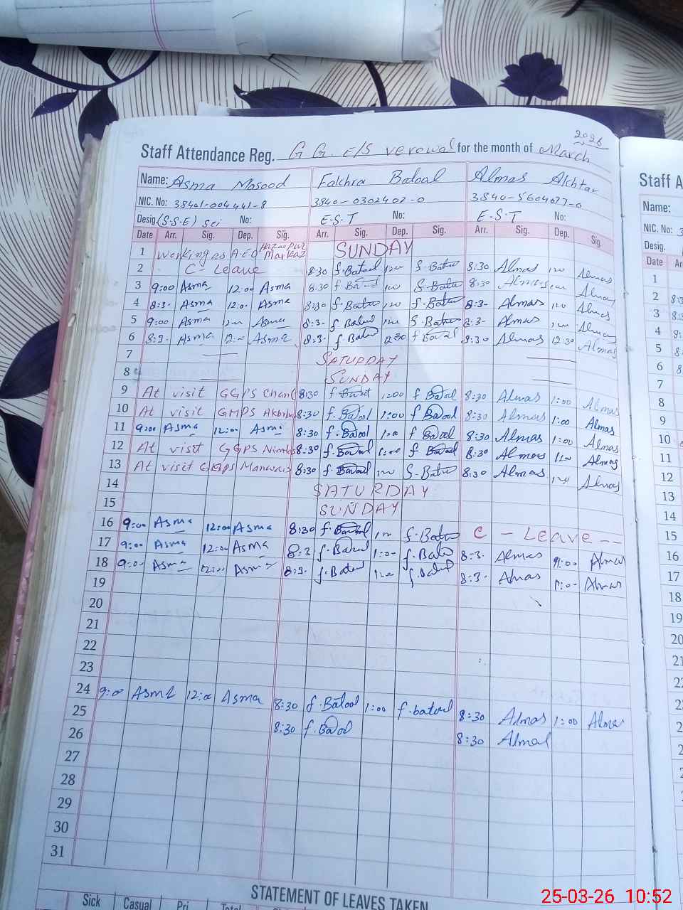 | CNIC | Full Name | Designation | R/C | Absence during last cal. month |