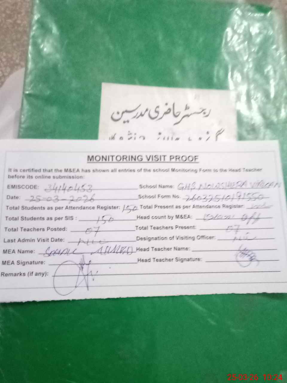 | Attendance Register | Head Teacher | MEA with School | Visit Proof |