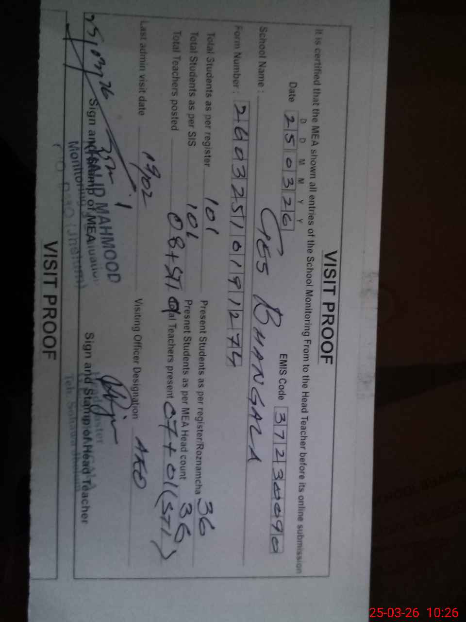 | Certified that this School was Inspected by the Undersigned MEA/DMO Today and the Information Stated Above is as Per Record. | |||||