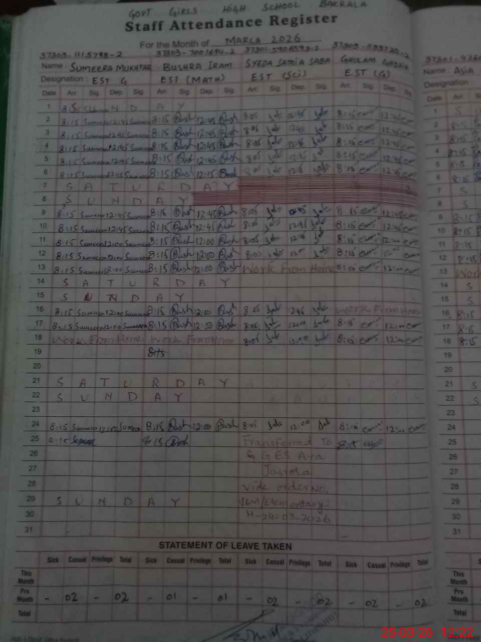 | Total no. of Classrooms: 13 No. of Classrooms Used for Teaching: 8 No. of Classrooms Storing Old Furniture, FTBs, etc: 0Comments if Any: Primary and high classes are not available because they have given their papers now these classes are spare from school as by the order of govt |
